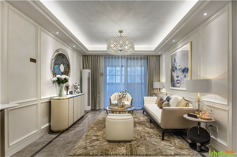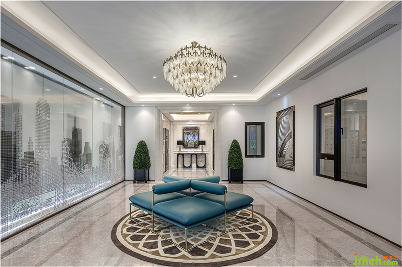 从入户玄关开始,对称式的结构布局、玻璃上的都市掠影、华丽的水晶灯,就像是一个引子,让人对室内空间充满期待。