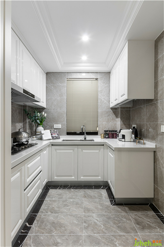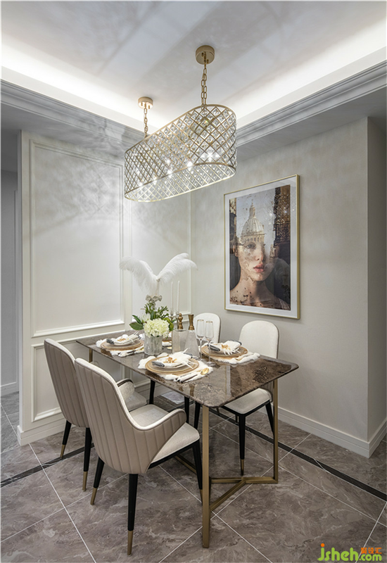 硬装上延续了大都会建筑风格,墙面以墙纸装饰为主,局部结合护墙板来丰富和装饰空间。色彩上以米色为空间基调,与地砖形成的色彩对比,使得空间在轻盈、素雅之外,再添沉稳。客厅家具简洁时尚与精心搭配的软装相趣成章,电视柜上的芭蕾舞主题摆件、边几上Artdeco风格的装饰相框以及了不起的盖茨比主题照片,一切都是那么的不言而喻......