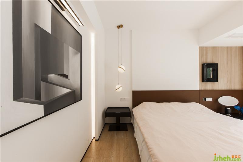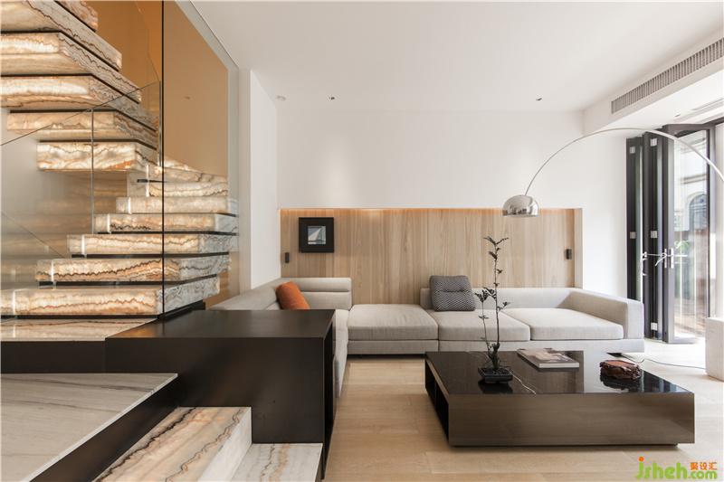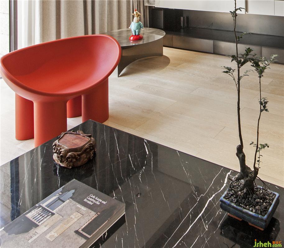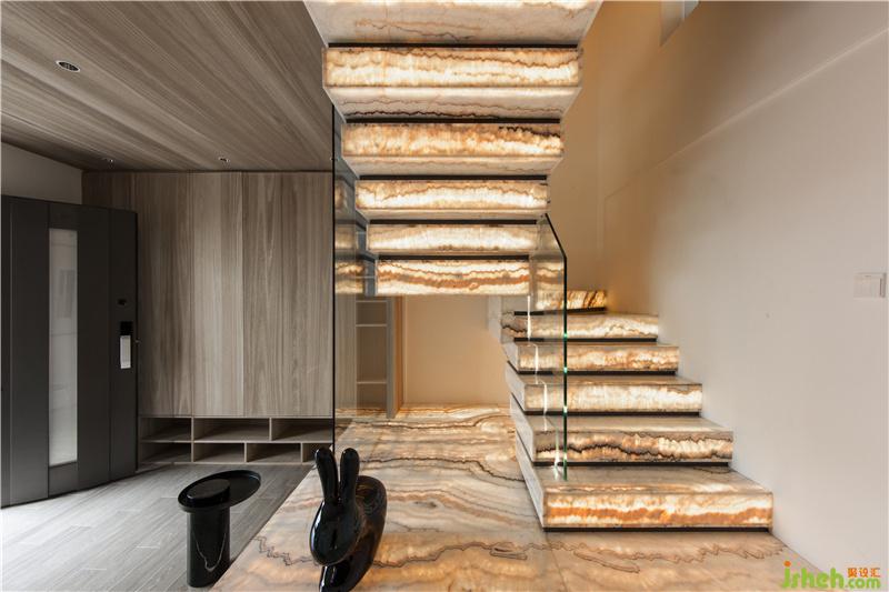 从一层开始向上蔓延的楼梯成为别墅内唯一的垂直动线。为改善原有楼梯陡且窄的问题,通过艺术塑造,使其成为屹立于整幢别墅里的巨型“艺术品”。光从玉石包裹中透出,柔和、温暖,极大地弱化了原始楼梯给人的抗拒感,也成为空间的亮点。佛山别墅装修设计在旁边挂上一幅现代艺术画,随意摆上一张设计感的椅子,现代艺术格调充满了空间。