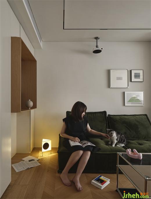 拼花设计的地板,是客厅和走廊区域的分界线。客厅没有安排电视,装修公司USM边柜、茶几,Studio so slow月升落地灯等高颜好物,是这里的主角。