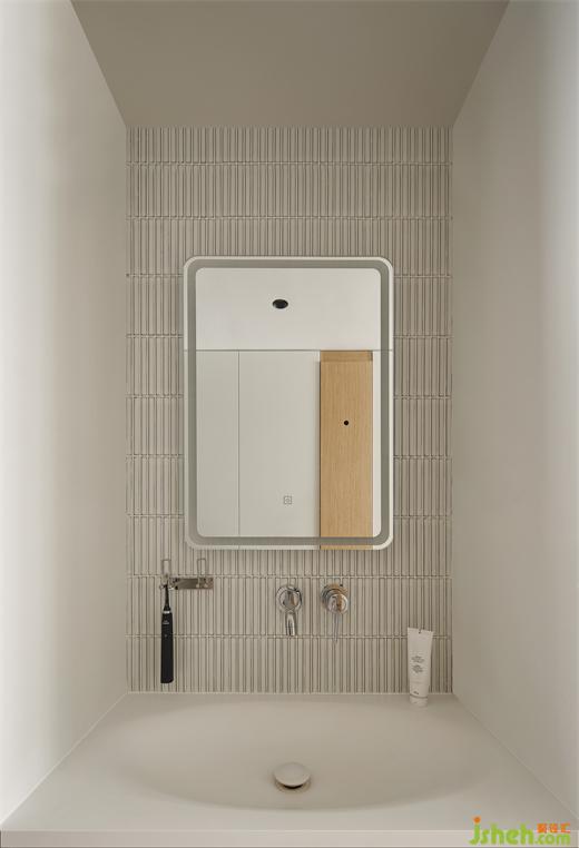 和走廊融为一体的洗漱区,条形马赛克瓷砖细节满满,装修公司用可耐力材料一体成型定制的洗手池,美观的同时又没有卫生死角。