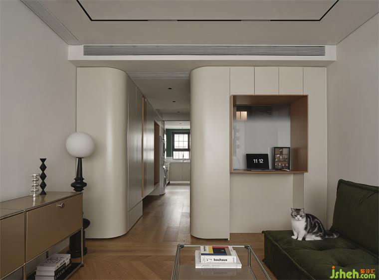 从玄关延伸而来的浅色柜体,装修公司扩大了整体上的视觉效果,是家里的主要收纳区。