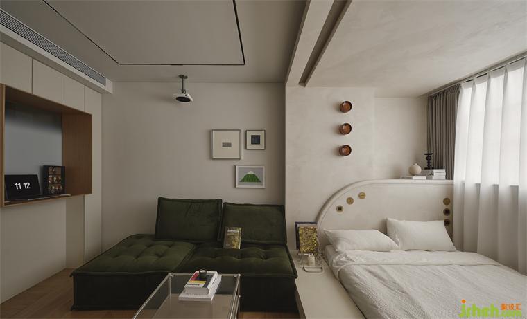 原本的卧室区域,设计师用空间膨胀的设计手法,改造成了客厅+卧室的复合空间。