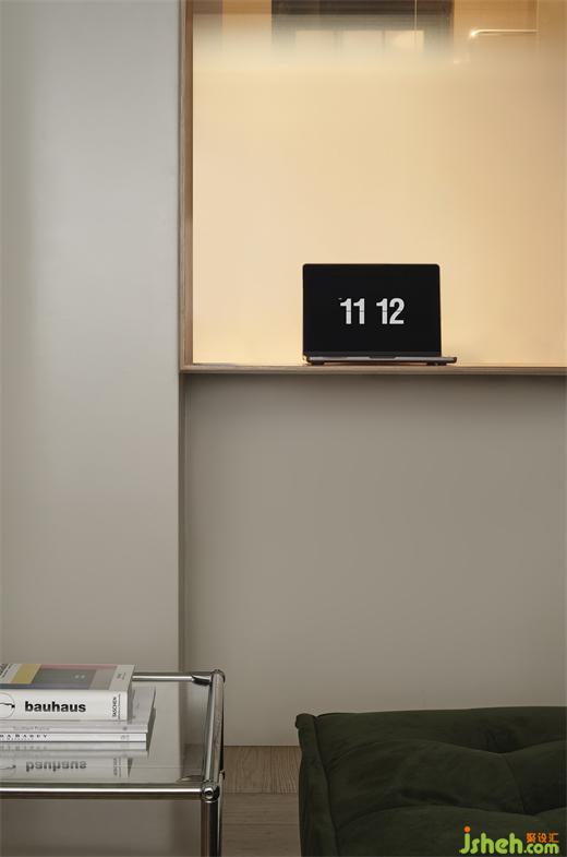 在卫浴空间和客厅的交界处,是透光不透人的雾化玻璃,是家里的第二扇“窗”。Kate平时可以坐在窗边惬意办公。