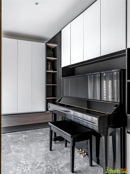 入户玄关结合原先的灰色地砖,做了两组穿插的黑白柜体,华润润府装修设计巧妙的将客厅门隐蔽在里面,新增的钢琴区更好的烘托了入户的仪式感。