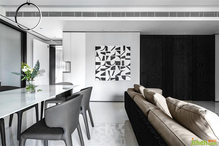 意大利Flos Arrangements的吊灯,用最简单的线条勾勒出空间形态,华润润府装修设计视线聚焦处是一幅抽象的块面手绘油画,灵动的跳跃在空间中。