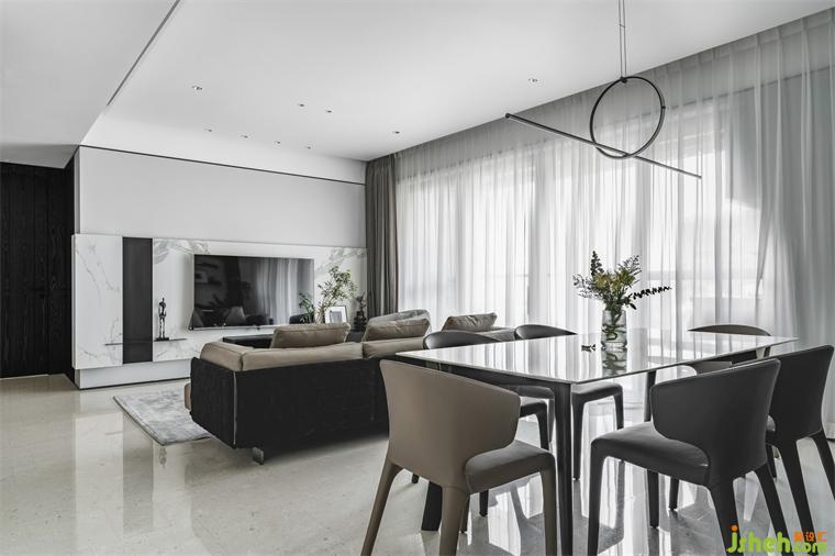 客餐厅作为家中最核心的区域,见证着这个家所有欢聚的时刻,华润润府装修设计整个空间依然延续着黑白灰的主色调,电视墙和餐边柜在兼顾储物的同时,也做了适当的留白处理,给了空间更多的呼吸感。
