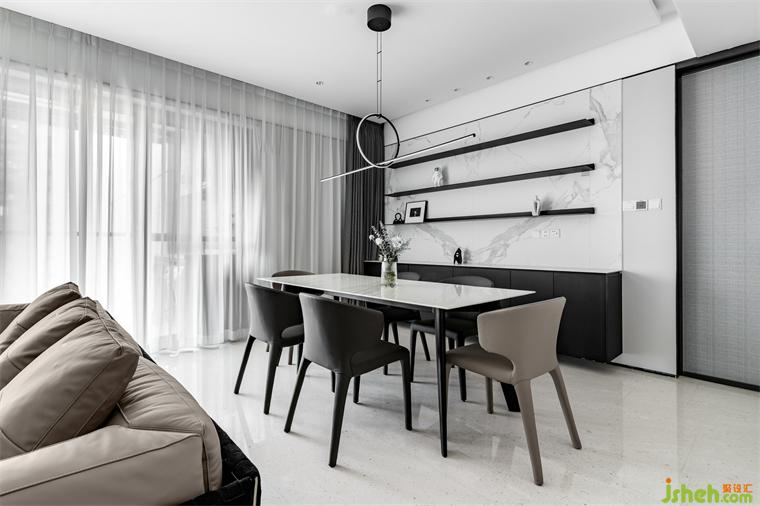 光洁的餐桌台面与餐边柜背景遥相呼应、相辅相成,点缀上黑色不锈钢层板,精致感十足,美好的生活,总是藏在日常的细节里。