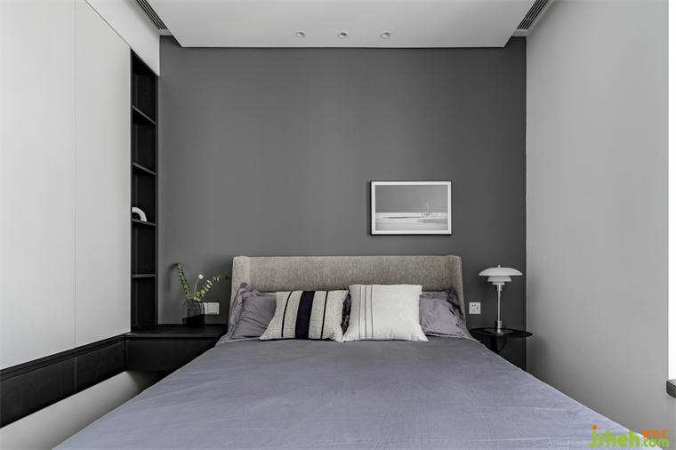 父母房巧妙的用衣柜和床头柜做了结合,横纵向的延伸,无形中扩大了空间,深灰色床头背景的铺陈,使得空间更为沉稳,再加以装饰画的点缀,尽显优雅舒适。