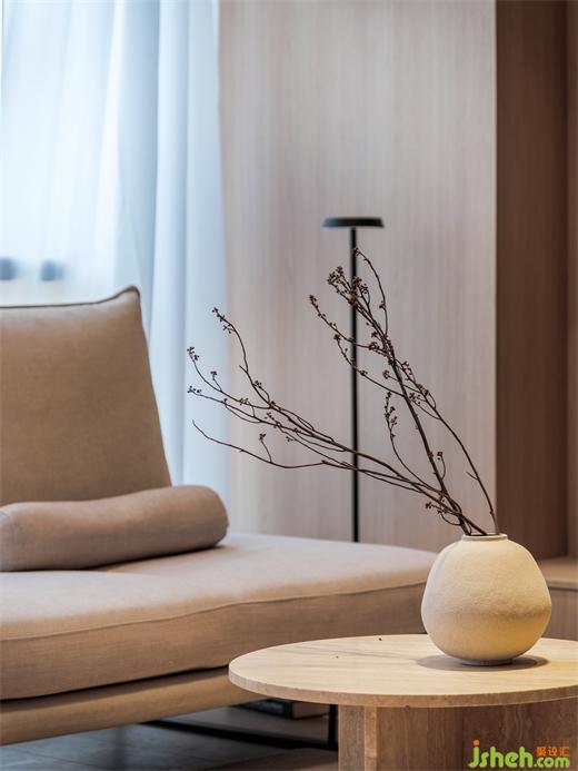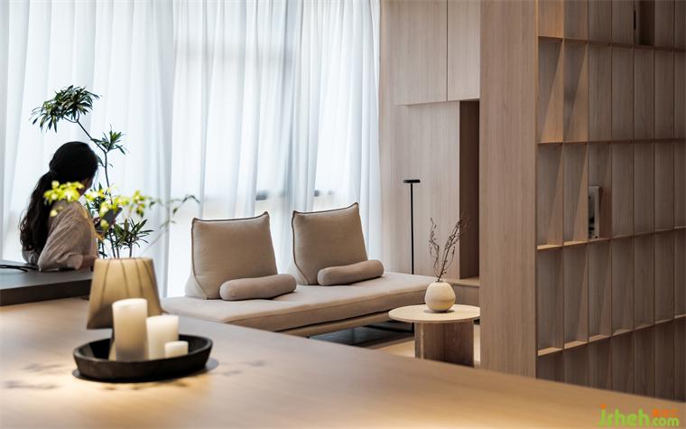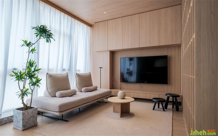 整个空间选用一款具有代表性的木色,从顶面转折延伸至地面,装修公司创造出统一和谐的韵律。