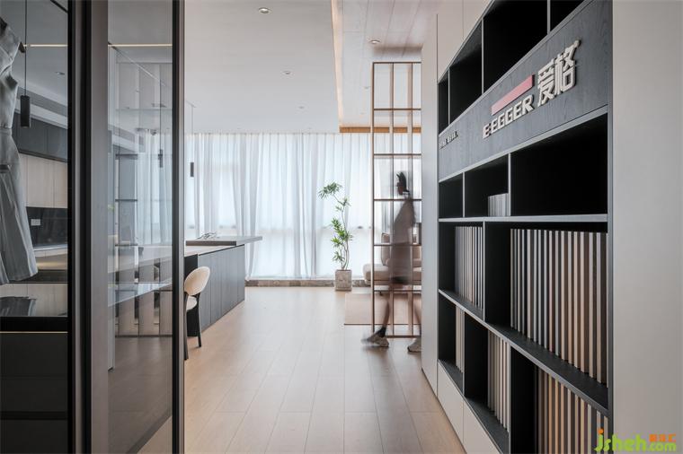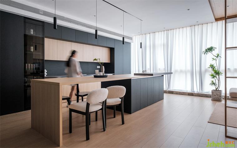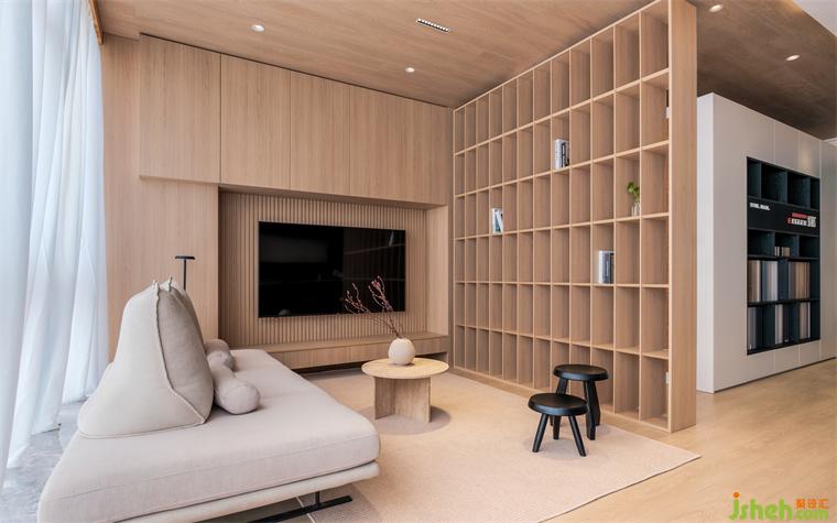 在空间的功能的分布中,我们用柜体、隔断等功能展示去替代实墙来划分区域,装修公司通过不同的材质和体量的调整,来减轻空间的压迫感,高低错落的盒体,趣味性十足。