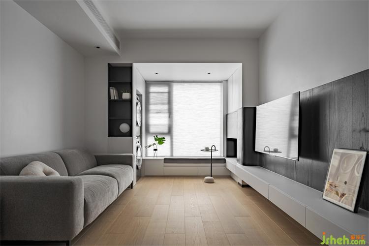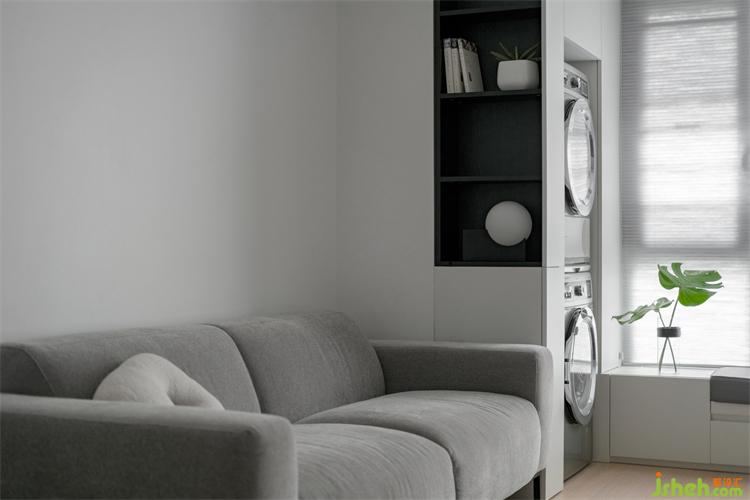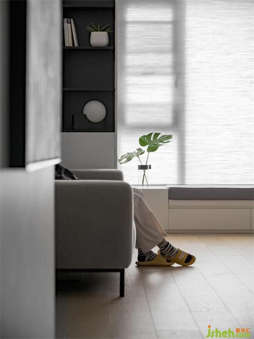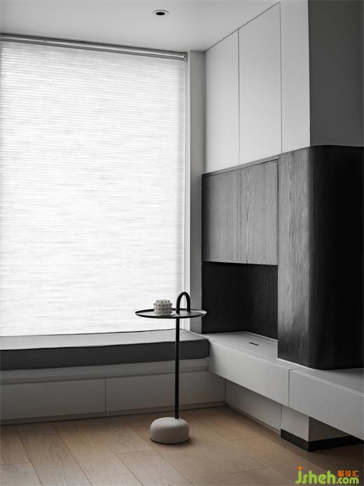 大面积的落地窗下安置的白色卡座,配上小小的边几,便成了休闲放松的小角落,下面的抽屉,也可用于收纳家中的小物件,一线一面,都呈现出次序分明的空间状态。
