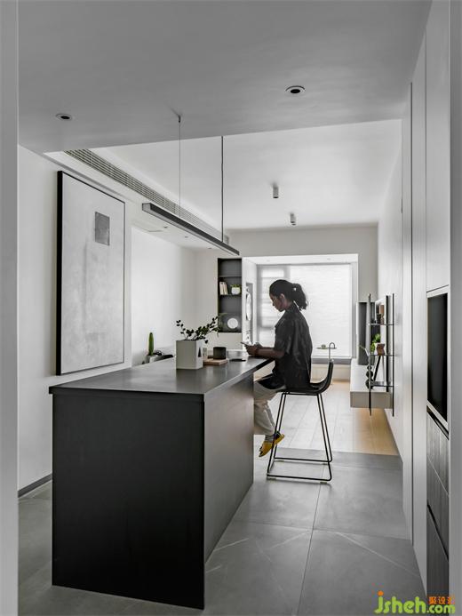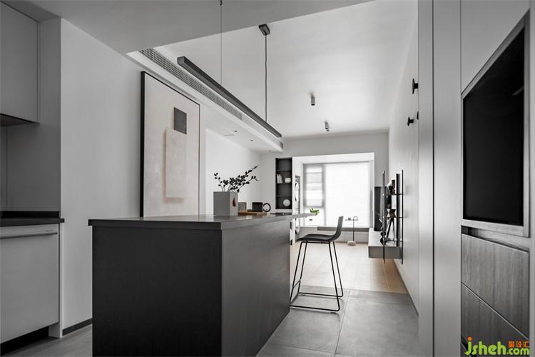 化繁为简,空间打破原有闭塞的格局,家装设计将客餐厨连成一体,半围合式的客厅,休闲且随性,餐厅岛台一字延伸,划分出就餐区,格局规整统一,黑白两色构建了整个空间,清晰而又生动。