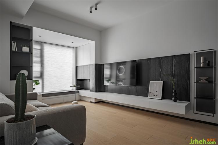 客厅以黑白色调铺陈,更显空间开阔通透,家装设计休闲区的卡座延伸到电视柜,形成了半围合式的空间形式,拉近了彼此间的距离,整面中空的黑色木饰面板穿插其中,打破空间的滞闷感,黑色的不锈钢吊架与沙发旁的开放柜点缀其中,灵活而又生动。