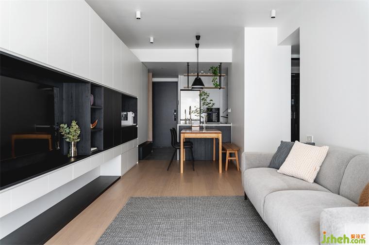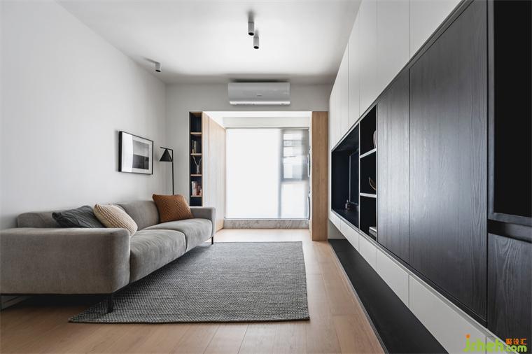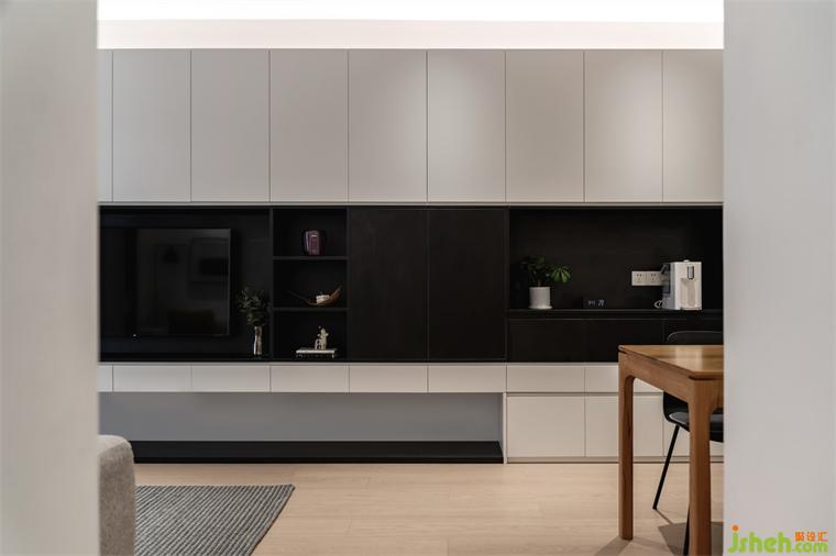 整面白色的储物柜既保证了充足的收纳能力,又显得空间不压抑,同时运用一些黑色的开放格去打破视觉上的呆板感,柜顶留空的处理也拉开了空间的层次,显得层高更高,家装设计加上灯带的衬托,增添了一丝透气感。