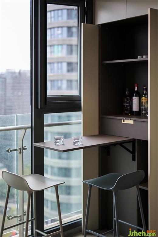 阳台置入一组可开可合的酒水柜,打开时可将桌面撑开作为吧台,抬头远眺,低头品茗,装修公司尽情享受时光的温度,关闭时干净平整,空间通透且自由。