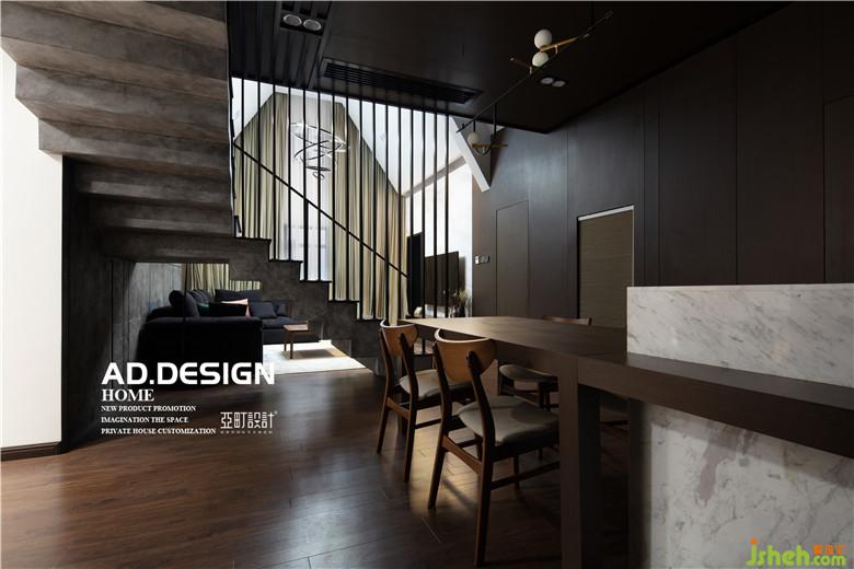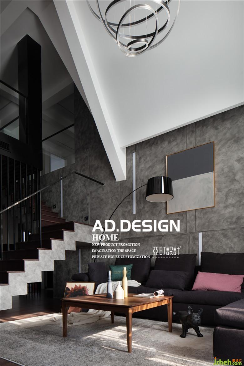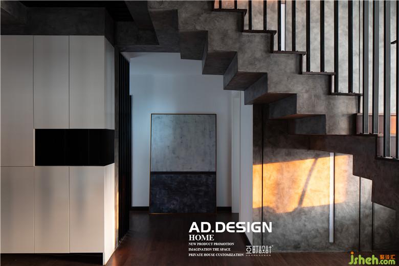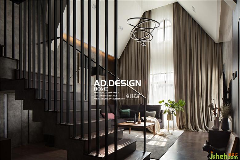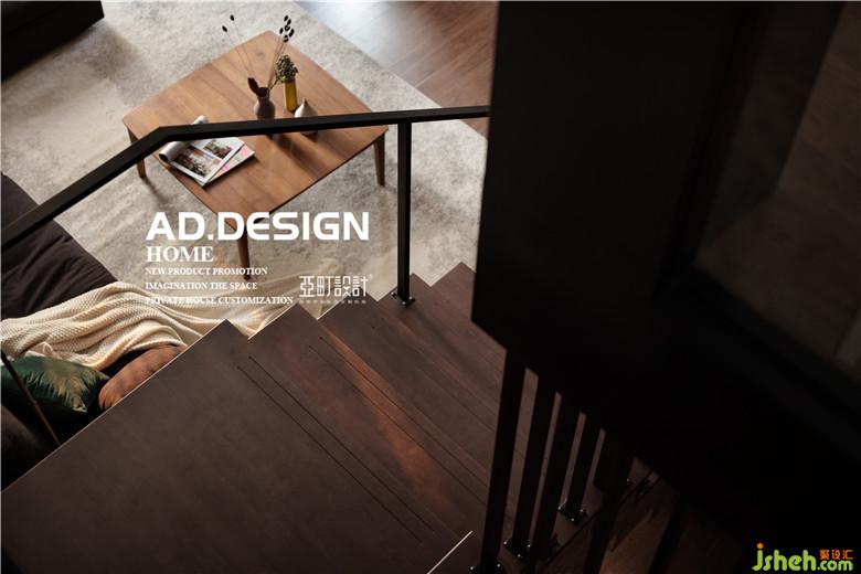 这是一个顶层复式,一楼的房高过高而二楼的房高又过矮,上楼的踏步比正常要多上几个,上楼还容易撞到头,因而楼梯的设计是室内设计师一个很大的难点。