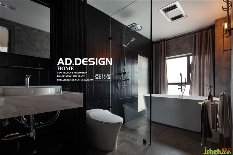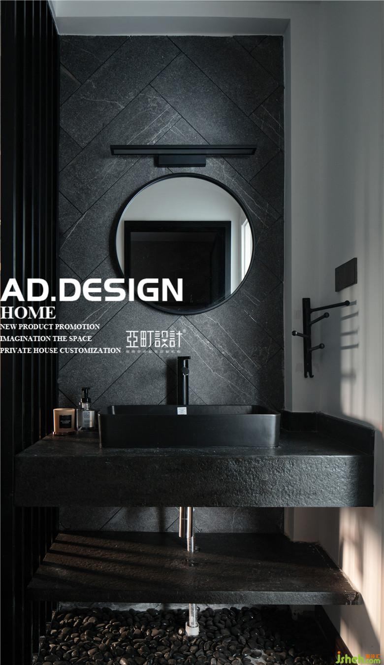 一层卫生间做了干湿分离,洗手台放置在过道,保证次卫的使用率,次卫的台面现场制作外贴毛石,墙面用了深灰色水泥砖错铺,呼应整个空间酷酷的基调。