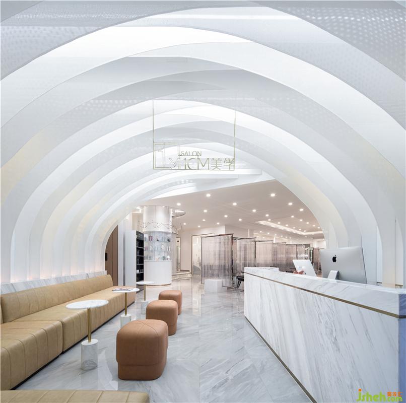 入口处的白色纱网拱道,灵感来源于古欧洲宗教建筑,用现代的方式重新解构表达古建筑形态,使空间既有现代风格的干净简洁基调,又带有一点古建筑的优雅神秘灵魂。