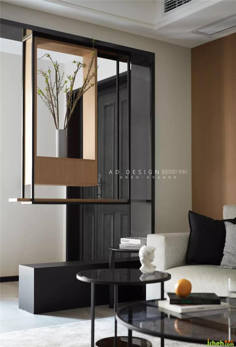▲入户处采用镂空鞋柜设计与不锈钢门套结合,同时延伸了客厅空间。