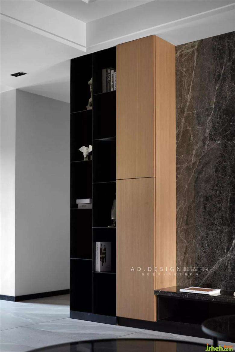 ▲裸露钢板柜搭配木饰面柜门,将配电箱巧妙隐藏至柜内。