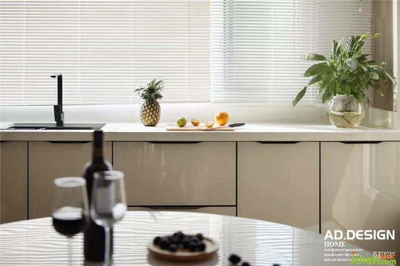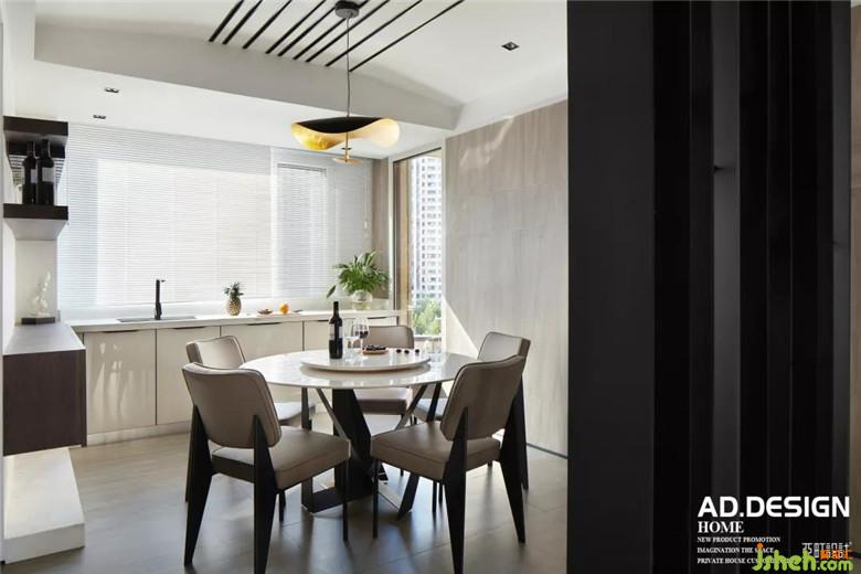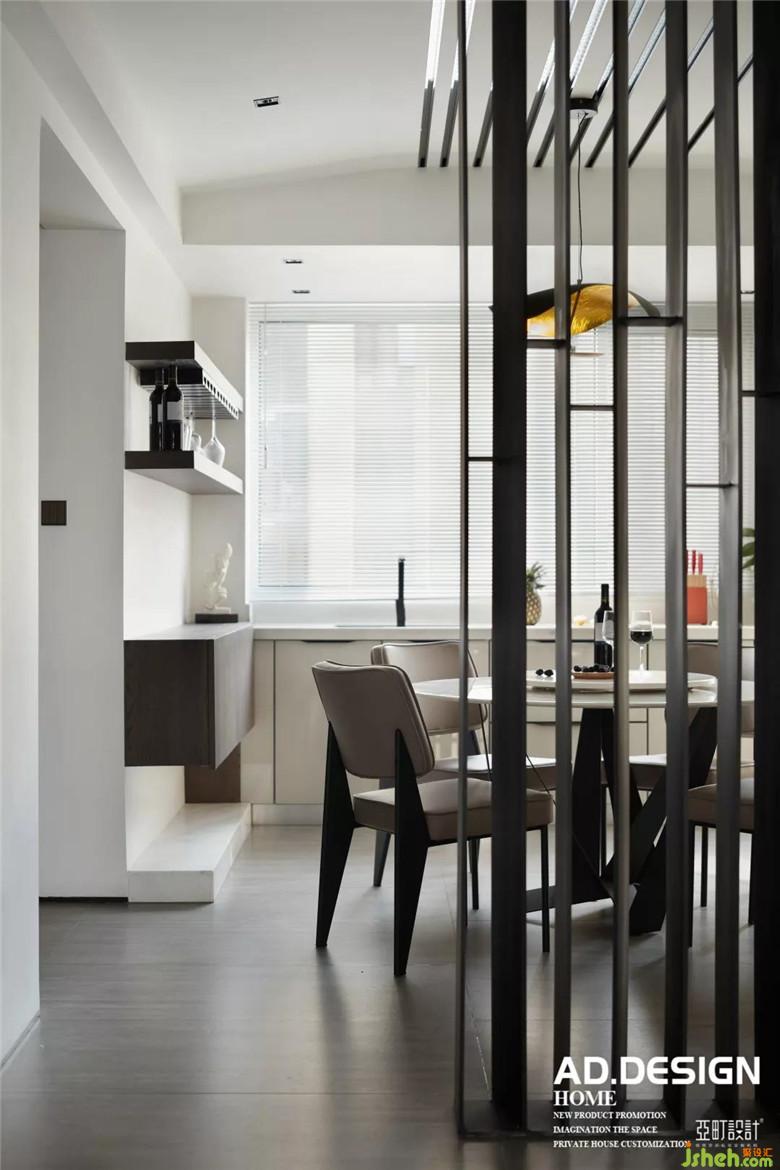 钢板隔断鳞次栉比的伫立在餐厅中央,顶面的不锈钢线条与其自然衔接,L型流线在整个餐厅里自然而然的舒展。白色玻璃橱柜、灰色磨砂砖墙面交错组合的铺设,丰富了整个空间的层次感。