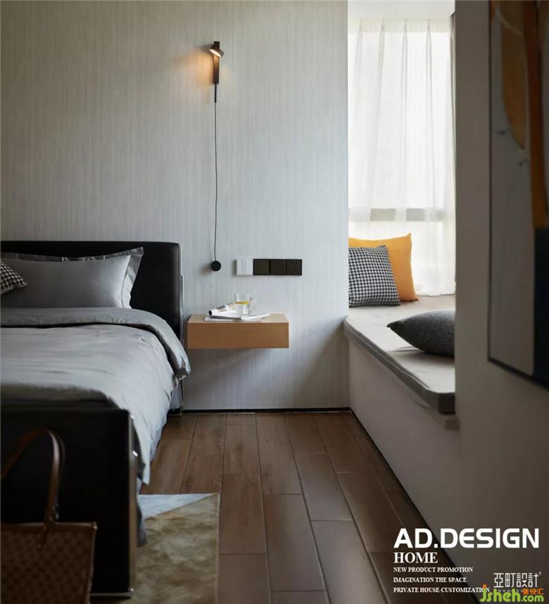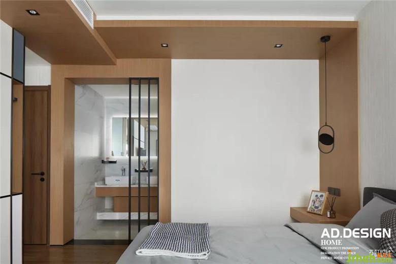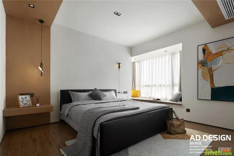 几何结构顶面、木饰面墙面、纹理感壁纸、是这个空间的面貌,装修公司配上设计感的壁灯和色块拼接画装点了这一室的温柔时,多了一份色彩的跳跃愉悦。