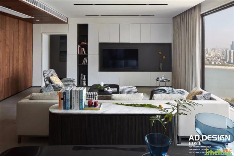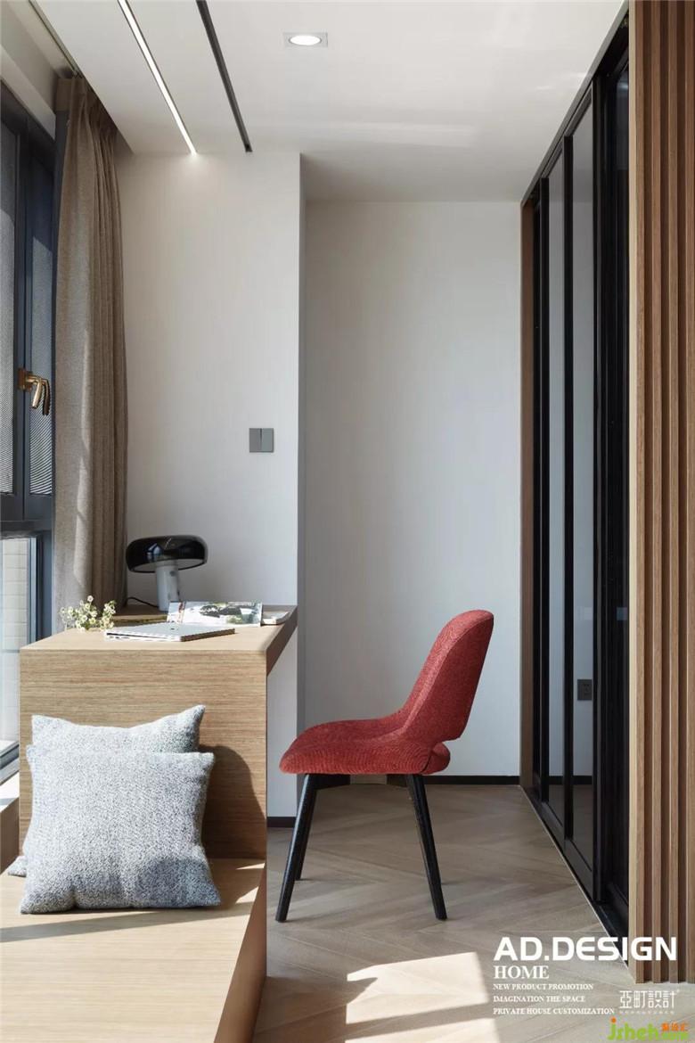 卧室内大面积的格栅墙面使空间更有延伸感,靠窗的一组木质地台,可供日常休闲,在天气好的时节,倚窗而坐,倒上一杯红酒,享受家带来的一种极具精致的生活体验。
