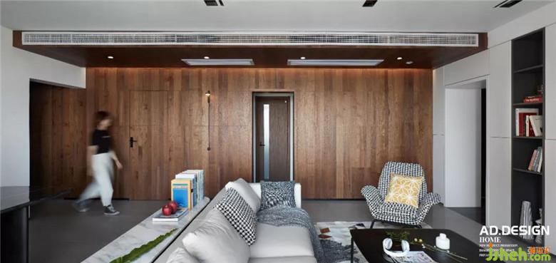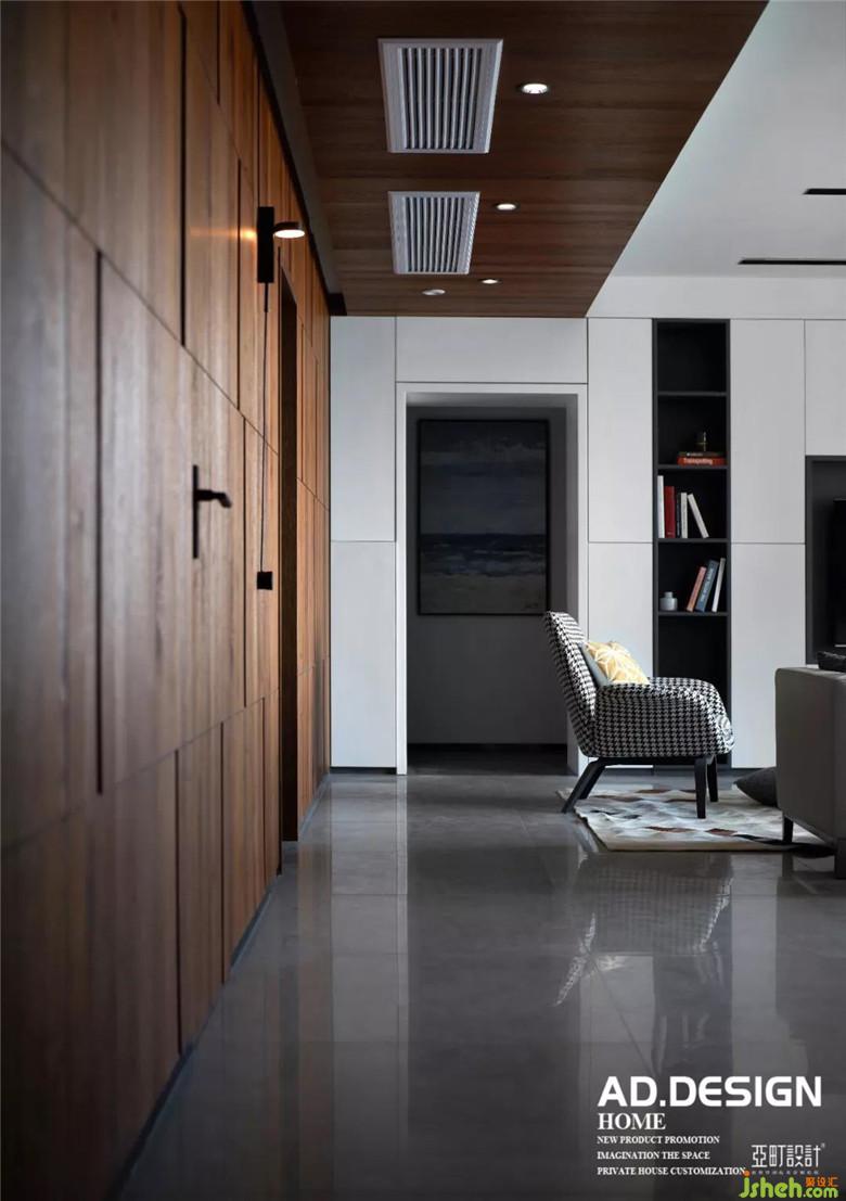 入户在原始结构上对原墙体做了一些调整,将鞋柜内嵌进墙体,从入户连结过道设计一整面的木质背景墙面,装修公司将卧室和厨房的门也融合在其中,顶面与墙面的木质组合构建出整个空间的视觉中心点,定下全房的主体格调,在过道尽头一整面柜体式的电视背景墙面,既创造一个简约大方的视觉感官,也具备强大的家居储纳功能。