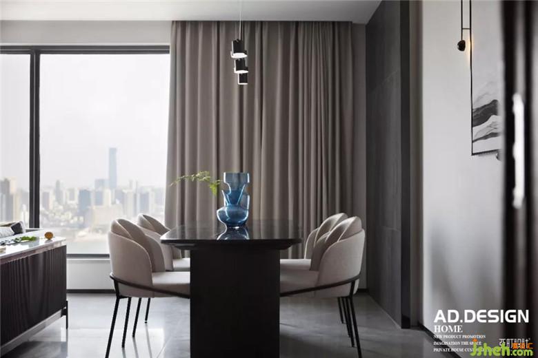 客餐厅整体的空间体验从顶面内嵌的黑色灯具做区分,既是一体,又各自分离,餐厅区域墙面的留白给到大幅挂画的空间,装修公司配合壁灯灯光的映射,让空间变得更加灵动。