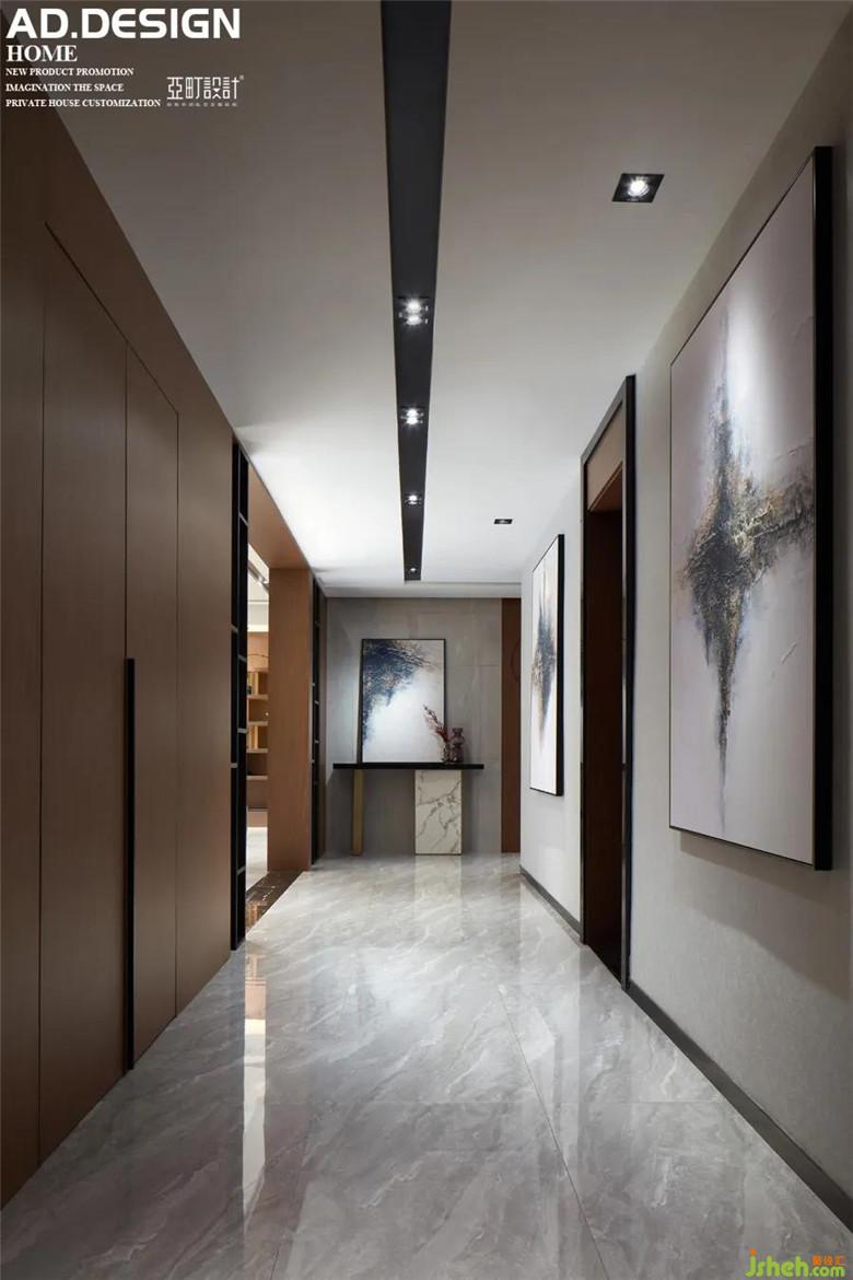 ▲玄关 | 整面通透的大理石方砖与木面开放柜穿插,进门即可感受简练优雅的氛围。大理石边桌与意境挂画组成的玄关端景,沉稳且高级。