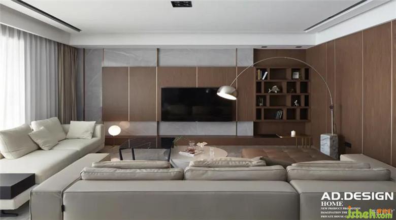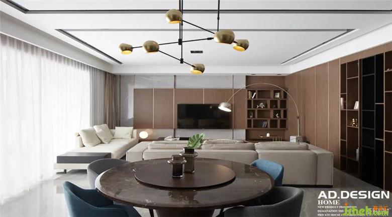 ▲客厅 | 装修公司采用纵向布局,开放的空间舒展连续,视野也变得更为广阔通透。电视墙以大理石为背景拼接木质的收纳柜,体块错落有序,消弥空间大块木色调所带来的厚重。