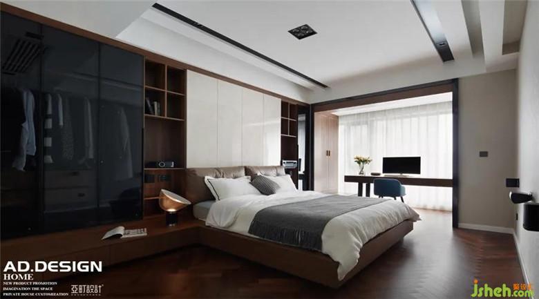 ▲主卧 | 大块的落地窗,采光充足。沉静质朴的木纹饰面蔓延着悠然静谧的气息。床头装修公司采用的浅米色块点破了整面墙体的暗调,丰富了空间的视觉层次。窗边的原木书桌点缀蓝色凳椅,体块干净利落,质感纯粹不失活泼。