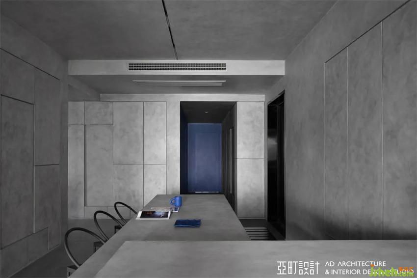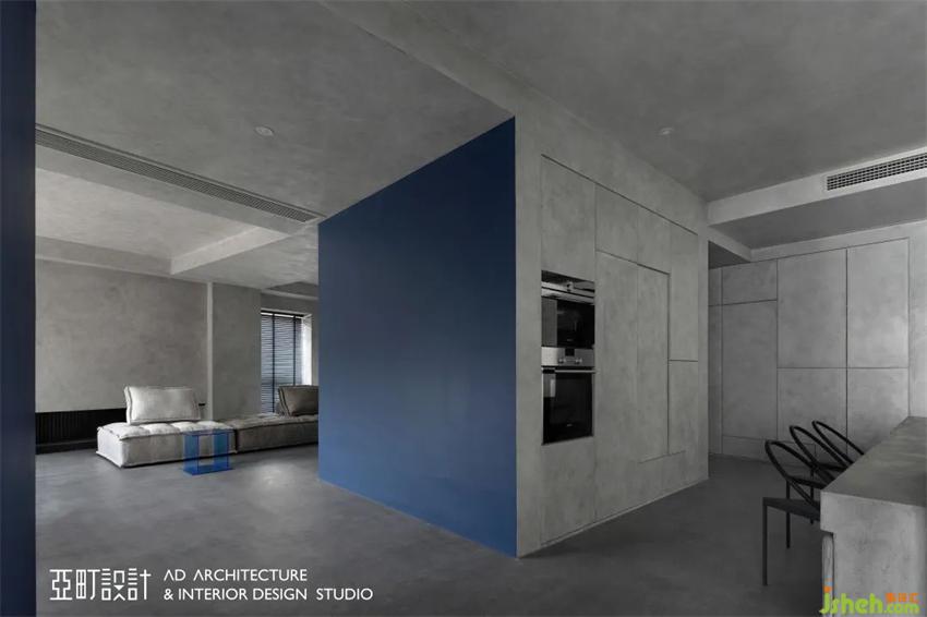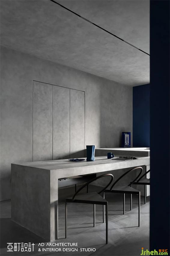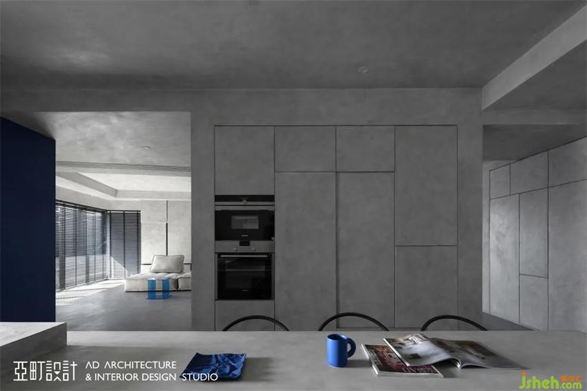 踱步至餐厅区域,莫奈灰主导着空间情绪,搭配纯粹的克莱因蓝摆件,一种特立独行的时尚感油然而生。