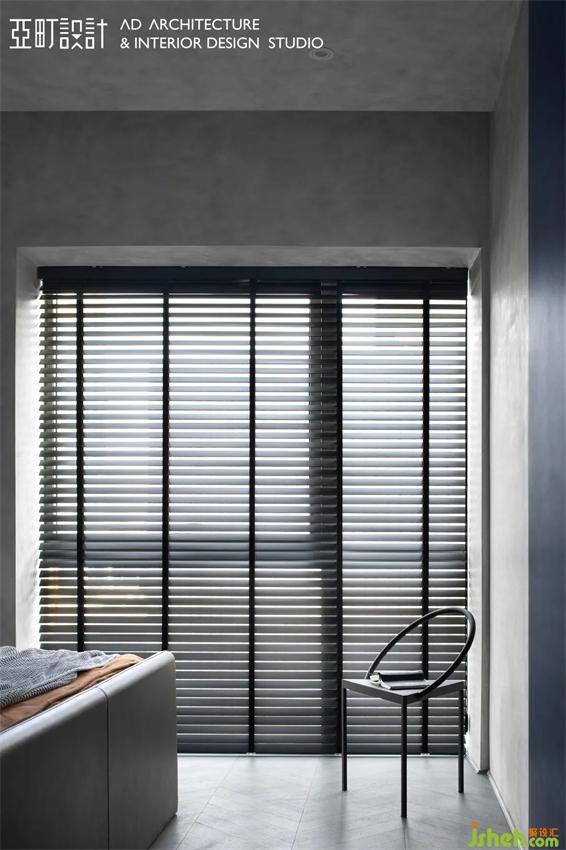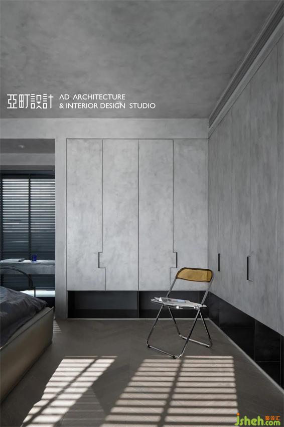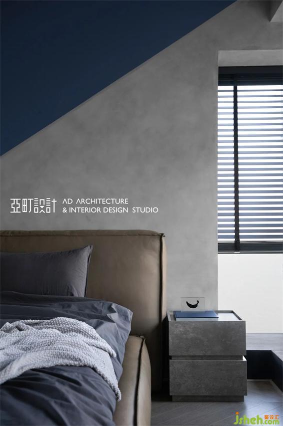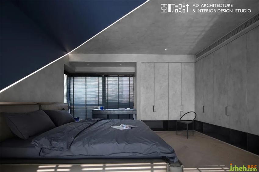 主卧延续了高级灰的主导,长沙家居设计将“线”与“型”贯穿整个场域,使空间丰富而有层次,斜铺在墙面上的深蓝,像是淌进了大海。