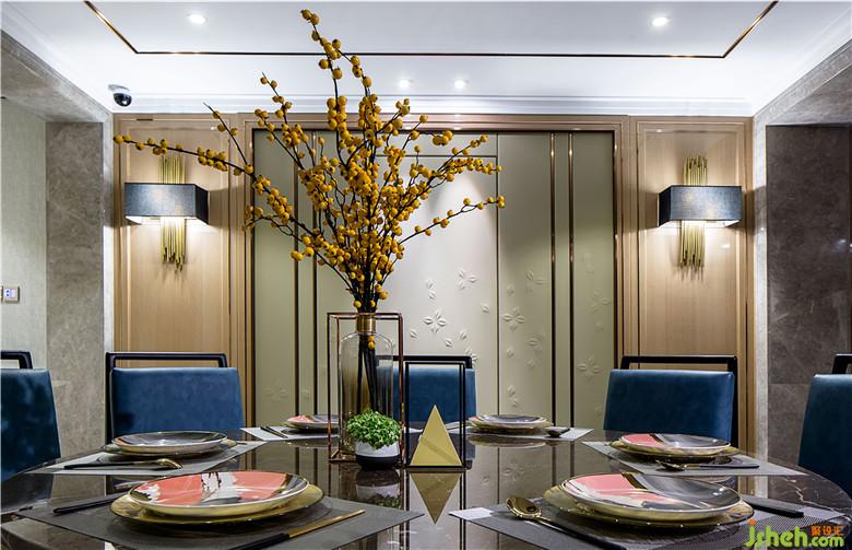 室内设计师采用高级皮雕材料,巧妙搭配自然质感的石材以及金属元素,璀璨的金色和几何经典,给予色彩最大的礼赞。