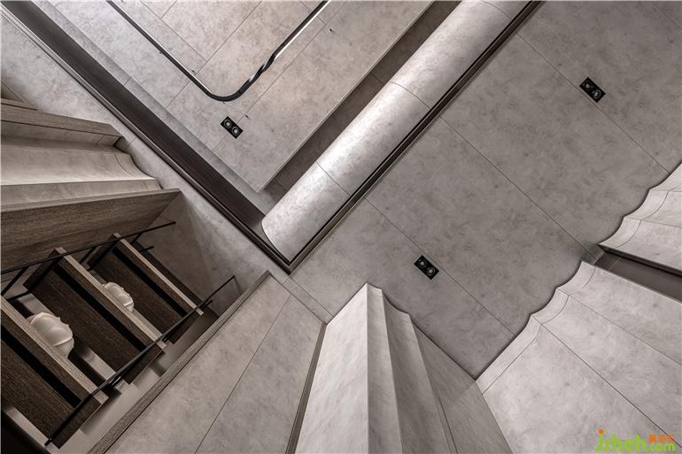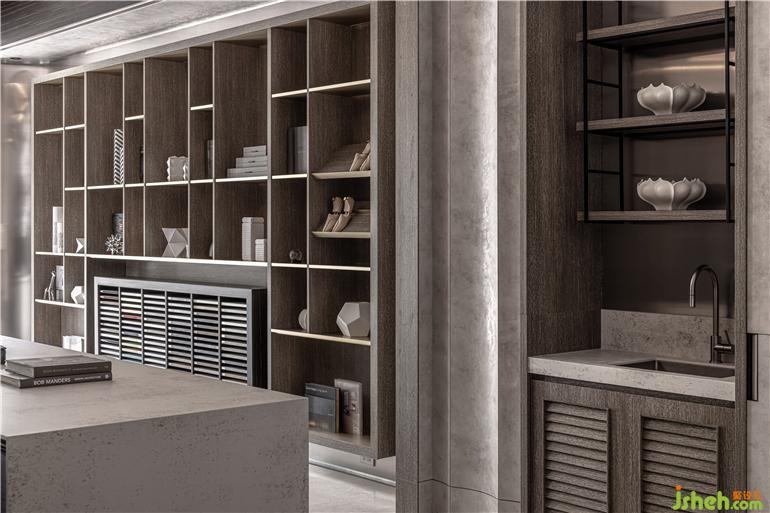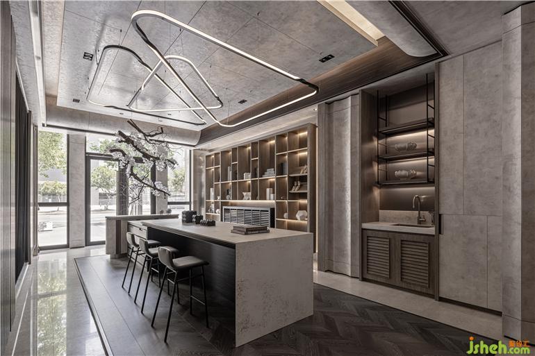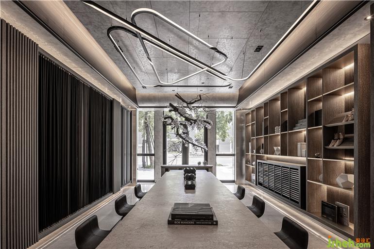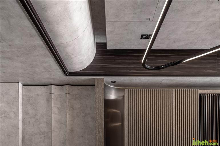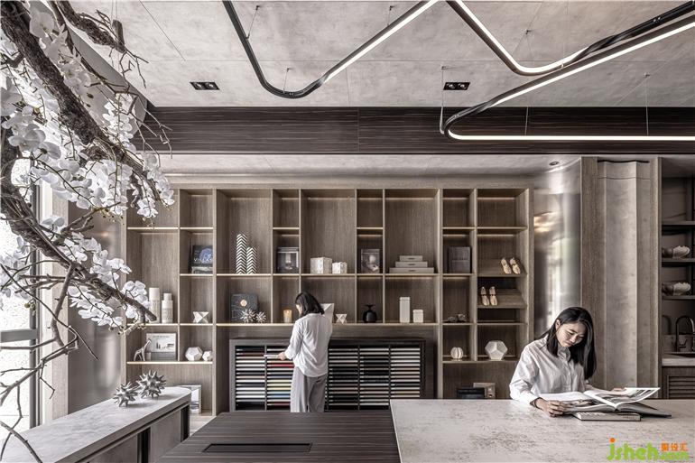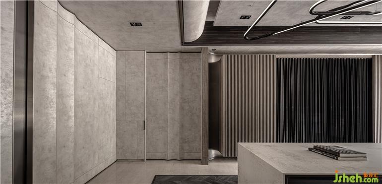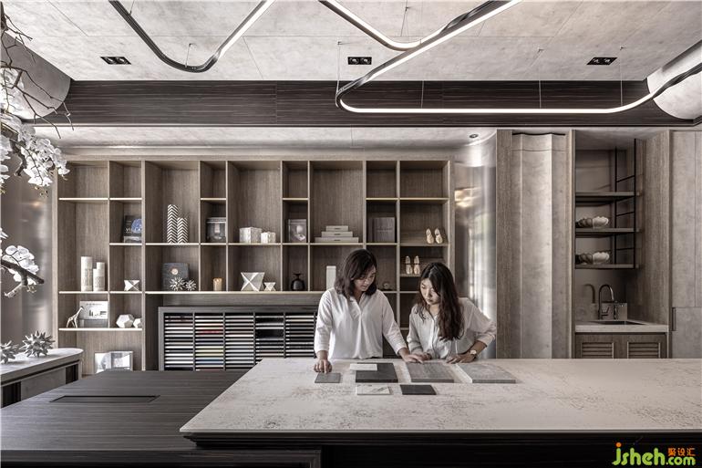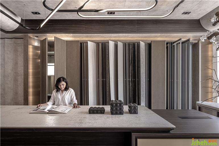 细致花艺揭开美好空间序幕,温润木质感结合柔美灯光营造适意氛围,而理性石材的丰美肌理与触感,则表现出细腻光泽和视觉层次。展厅设计以天花上两弧形造型为出发点,将8mm的系统板材以薄背切、弯折的方式达到曲线效果和折线造型,再延伸至墙面,巧妙发挥系统板材的可能性、重新定义也突破既有印象,实现工艺精神与设计构想,打造出饱满质感却自由无束的独特样貌。