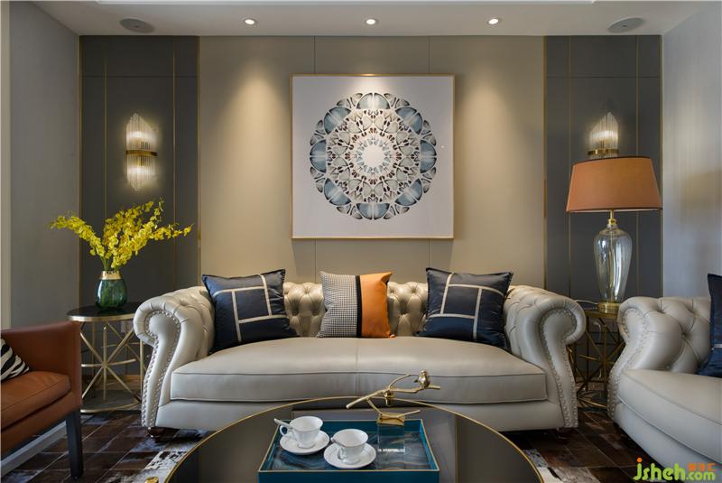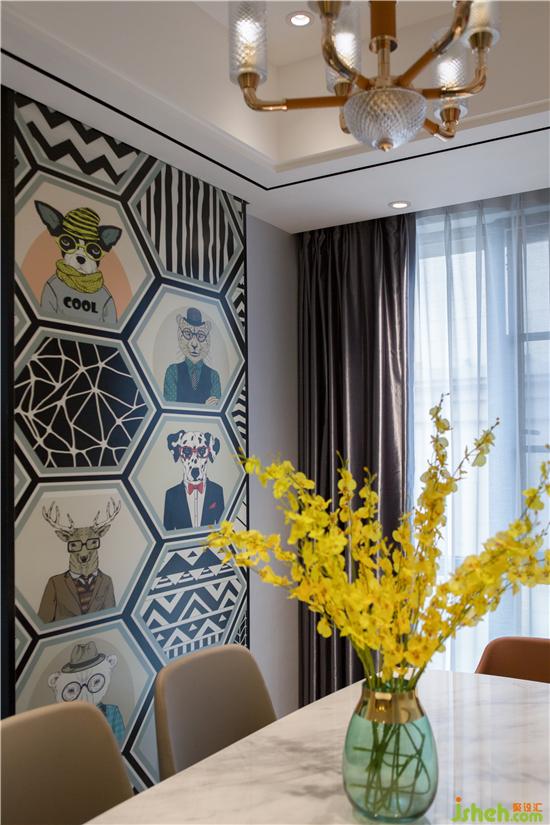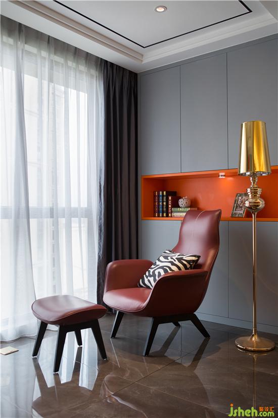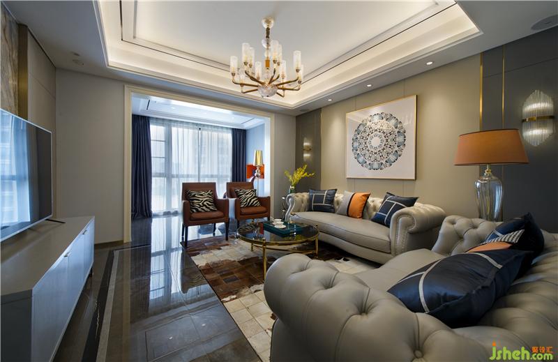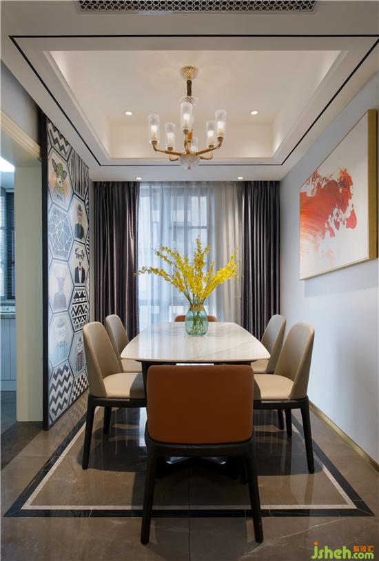 追求奢华,但又不张扬个性,把握沉稳,却又不失时尚氛围,在现代体验中追求轻奢的气息。整个设计将轻奢元素和现代生活结为一体。客厅以白色和高级灰为主色调,棕红色为辅助色,全屋大量使用石膏线打造出空间的层次感。灰色和棕红色搭配的沙发贵气十足。金色金属边框的茶几造型简洁大方,提升了空间的时尚感。电视背景墙采用整体为棕色大理石花纹的瓷砖,沉稳而又不失时尚,低调有奢华的感觉油然而生。餐厅与客厅是独立而又相连的区域,长方形的六人座餐桌气质高雅清新,大理石与皮革的搭配颜值颇高,金色框架的吊灯时尚个性,使就餐环境更加美好。