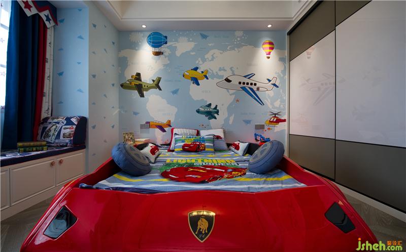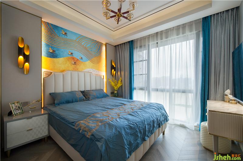 主卧的设计以米白色和蓝色为主,大片的落地窗时尚优雅,让整个主卧空间的采光性、观赏性和通风性都非常好,高贵优雅的皮质大床大气而又上档次。地面则是选择了脚感十分舒适的木地板来装饰,使得整个卧室简约舒适中透露着轻奢的感觉。儿童房中利用阳台的面积打造了一个榻榻米,保证了小朋友的娱乐面积,并且增加了储物空间,功能强大。家装装修