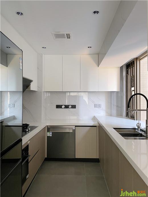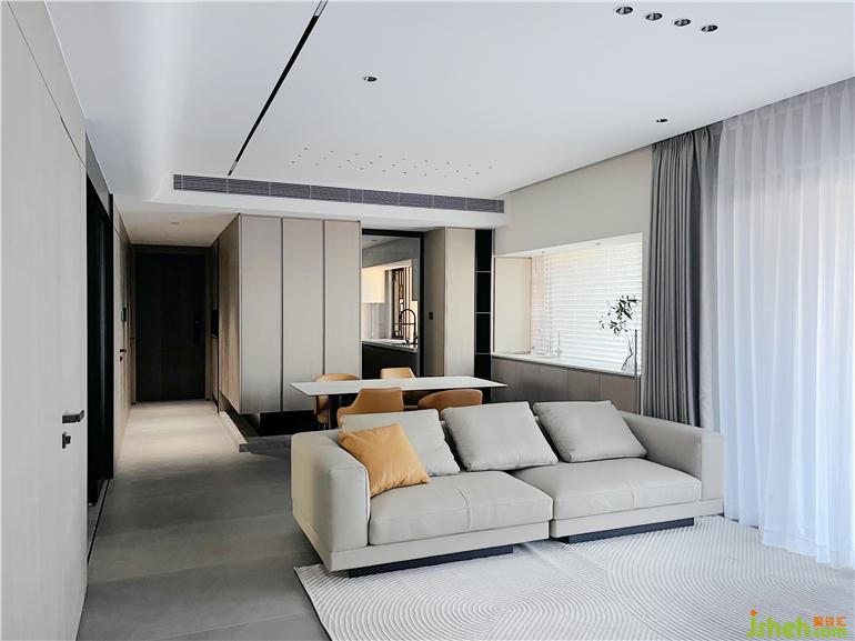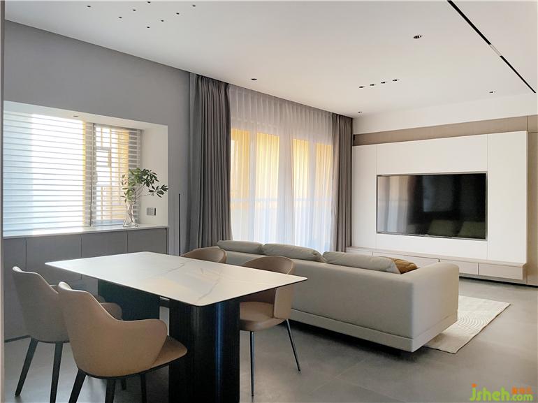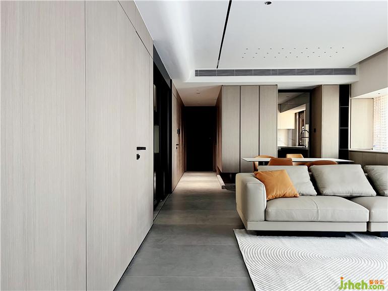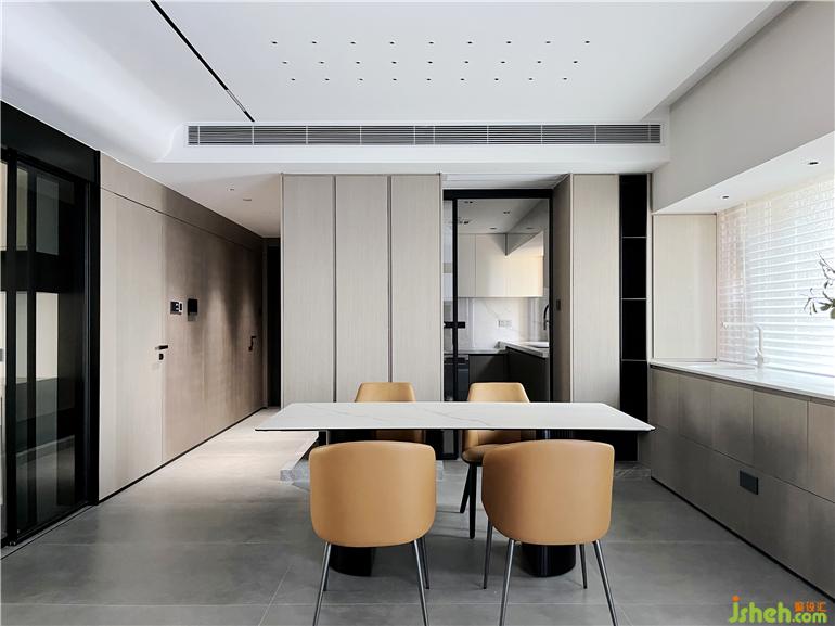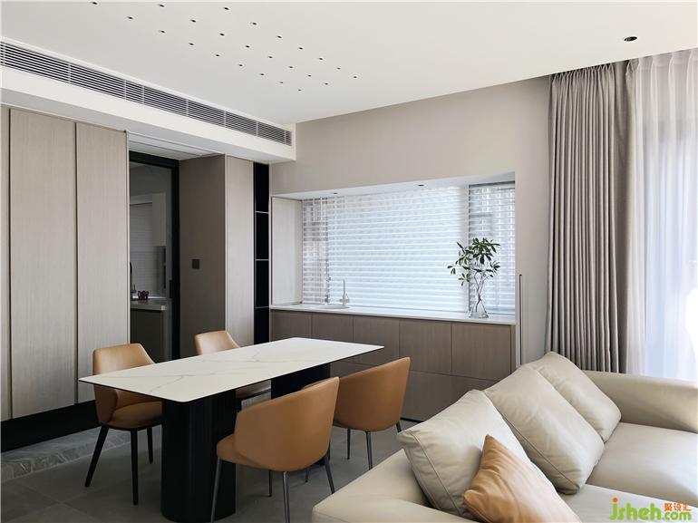 厚墙打薄增加空间的使用面积,书房位置打开,使客餐厅空间更大,深圳家装设计通风采光效果更佳,满足业主需求在简约风中,墙面没有过多的修饰,大面积木饰面使整个空间更佳简洁,块面明确。