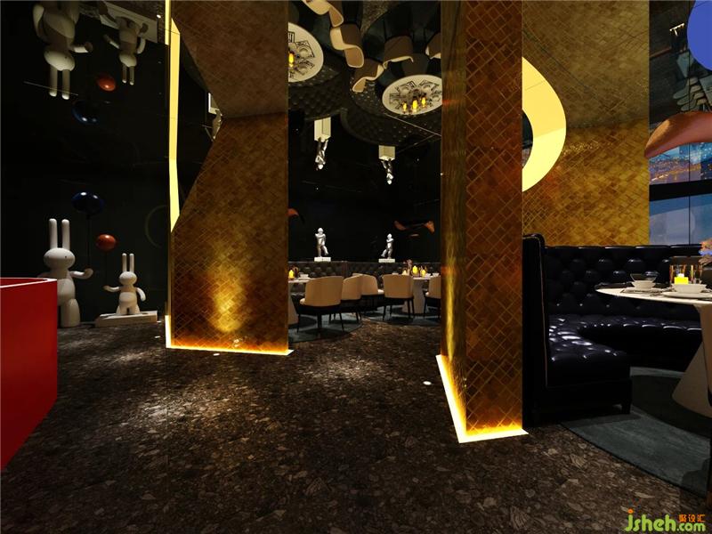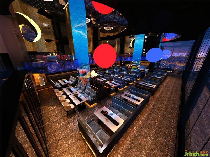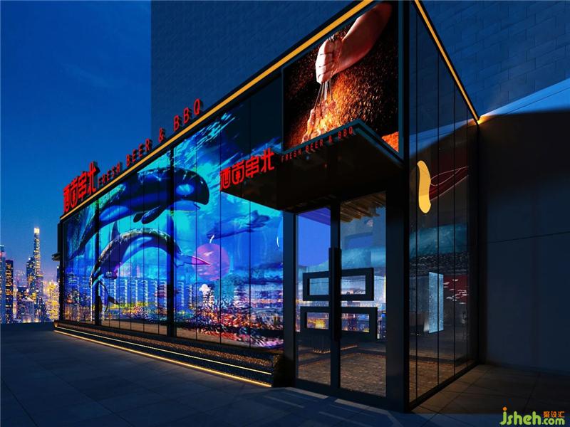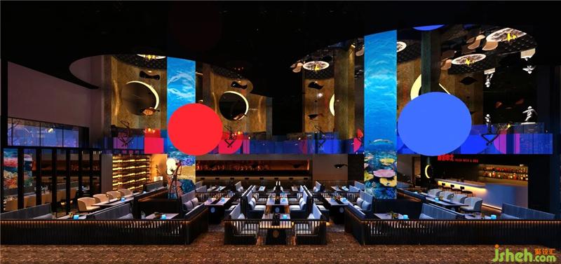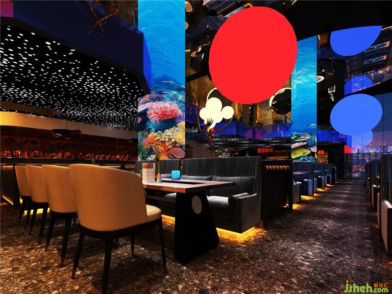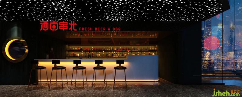 酒南串北寓意走南闯北,以酒和串串为主的南北饮食文化的结合体,所以本案在色调上也是以南方热,北方冷的特征为起点展开设计,以火热的红色代表串串的火热以及南方的炎热,清凉的蓝色代表世界啤酒的冰爽和北方的寒冷,冰火相遇,碰撞出奇妙的视觉感官。在装饰造型上,延续走南闯北的情怀,在外漂泊的时候居无定所,以天为盖地为庐,仰头漫天繁星,联想自己就像是浩瀚宇宙中漂浮的星球烧烤装修设计。