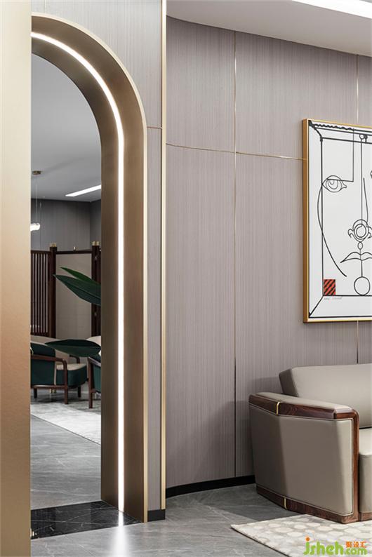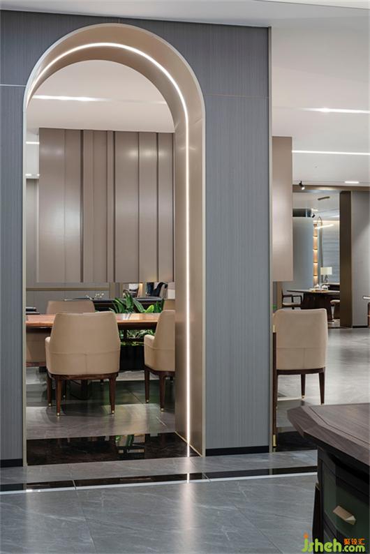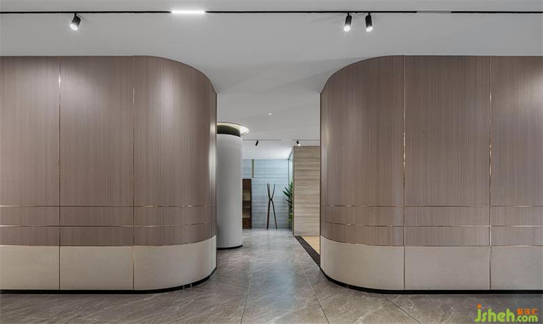 当空间被划分为不同功能空间时,需要用一个支点将空间各区凝聚起来。每个区域都有弧形造型来连贯,既贯穿各展示区域引导视觉动线,也以概念化手法呈现项目的核心理念。