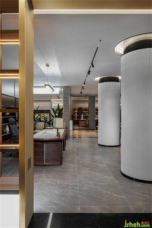 展示区的产品分布在每个造型区域,区域中没有过多的配饰,用空间放大产品的感受力。家具展厅设计在展厅的末端,为企业自用的办公室及休闲娱乐空间,开放式的办公设计,让来宾更能感受自由办公概念。