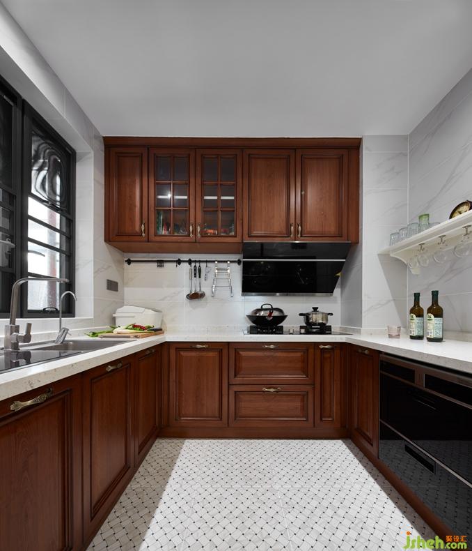 厨房具备功能强大又简单耐用的厨具设备,石材与木材的互相结合,使整个空间显得更加大气。原木橱柜的设计,搭配橱窗投进的一缕阳光,更为其增添一份雅致。
