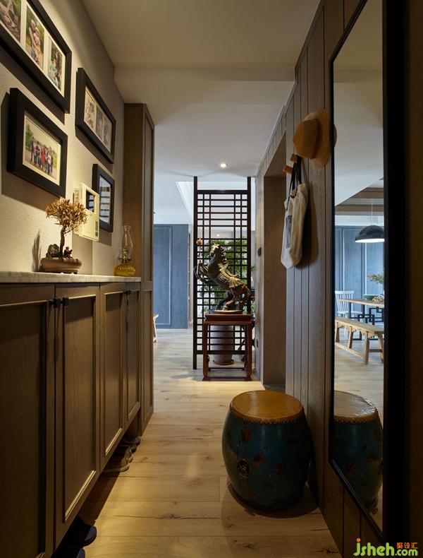 传统的门厅,必备的鞋柜。整个入户玄关墙面墙板鞋柜木工油漆全部现场纯手工制作。