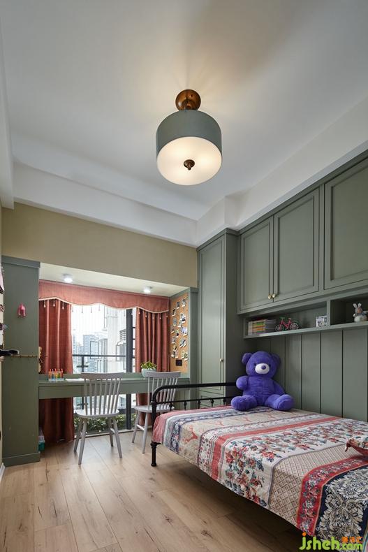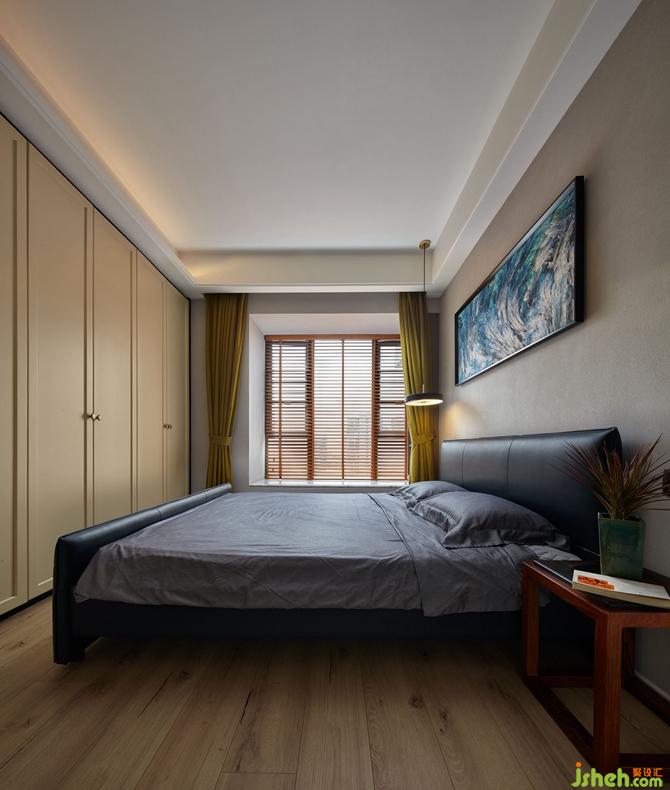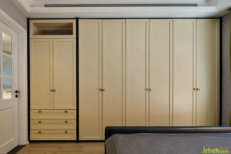 不要软包不要护墙板,我只要大大的衣柜及舒适的床;奶黄色的烤漆柜门看着很温馨,两口子的衣物全部装下。