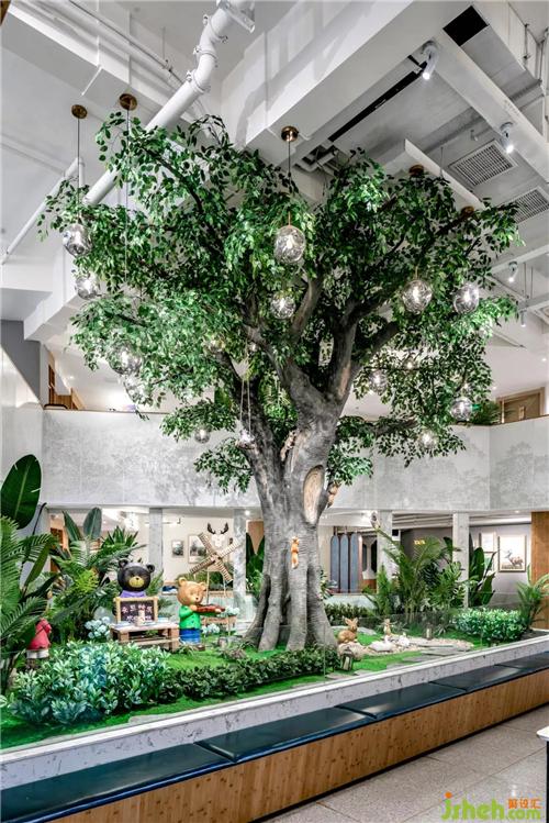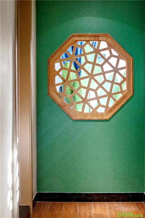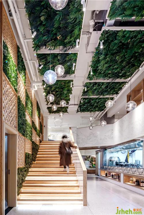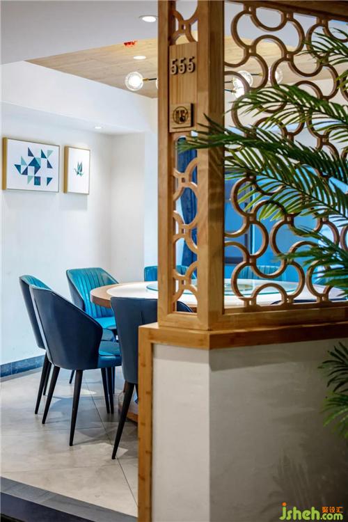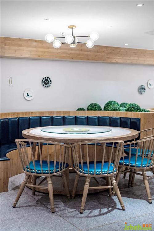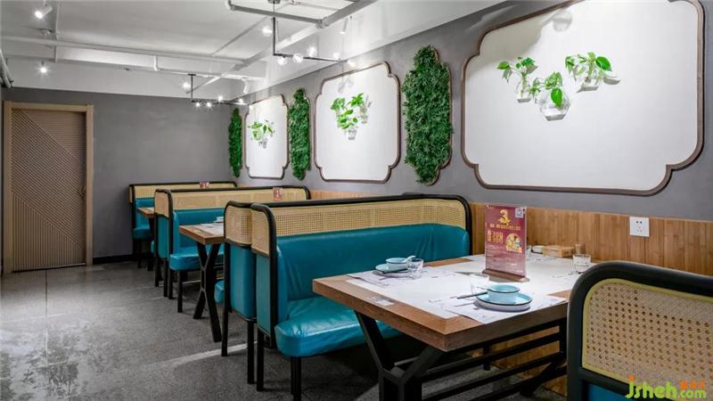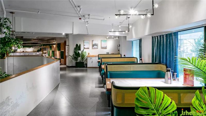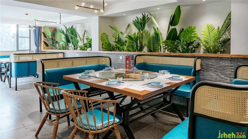 营造良好的空间体验,增强消费者对餐饮场景的满意度,是一个商业空间设计师必须考虑的因素。杨厨是本土的连锁餐饮,在九江拥有庞大的消费群体,设计师严洪萃取品牌“以原汁原味为主”的经营理念为设计出发点,以空间原木色搭配现代感跳色,再利用大量绿色植物多角度拓宽视觉空间,增强视觉效果。所谓“场所感官”的建立,是指在商业空间精致简练的氛围中运用一些能让消费群体熟悉的元素植入到空间,从而让置身于这个空间的人获得一种认知的重建,短时间内快速熟悉这个空间。餐厅设计