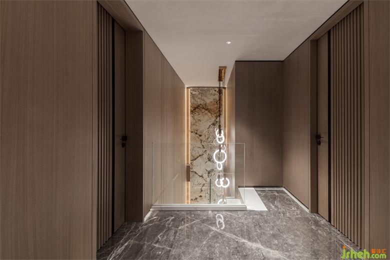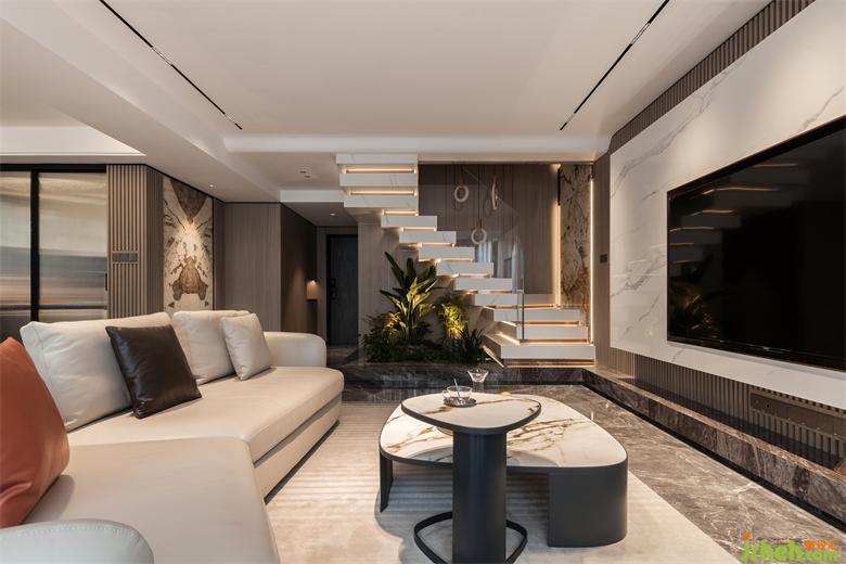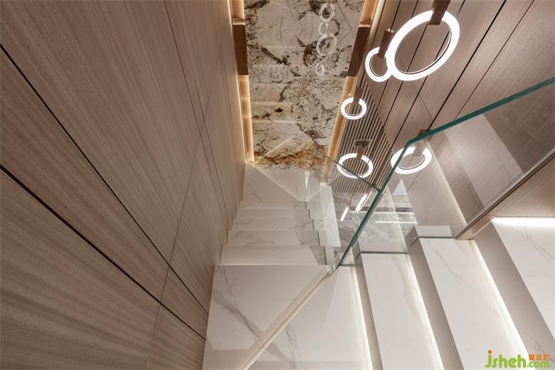极具质感的大理石,精致的金属线条,高光木饰面板,皮革,绒布,巧妙的搭配,打造出一个舒适、简练、奢华、温馨、明亮的居住空间。一楼主要作为休闲娱乐的区域,在设计上,我们更多的去打开空间,让整个空间更具灵动。对于复式楼来讲,楼梯是设计的核心位置,通过对空间大胆的改造,合理的打造出精美的悬浮式楼梯。岩板作为当下的主流,极致的质感追求,尽显他的与众不同,在背景墙、楼梯、吧台等位置巧妙的运用,通过局部精致的金属线条的合理搭配,共同打造空间质感。 染色墙板的结合给空间增添了许多温度,更有家的温馨。地面采用了灰色大理石,自然的纹理给了更多想象的空间。局部奢石的点缀更给空间增加了奢华感。在于空间的设计当中,简的存在主要体现在吊顶上面,在当下的时代,生活节奏的加快,人们对于简的追求更加的强烈,在设计的过程中简与奢的结合,使得空间更具涨性。