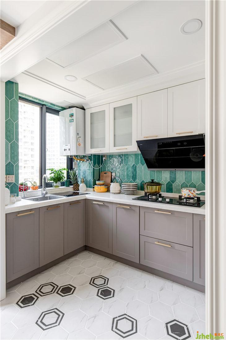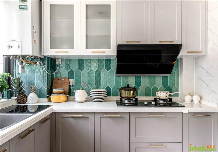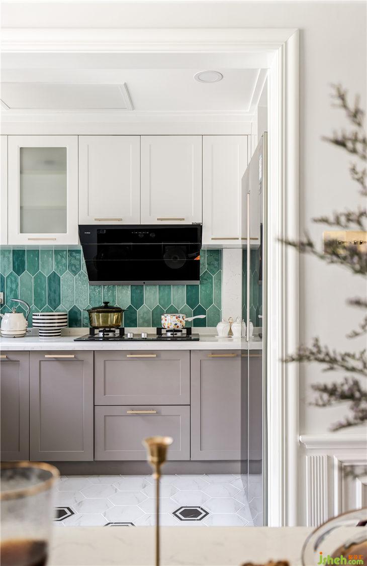 厨房的设计重点在墙地砖和厨柜的搭配上,因为是半开放式的厨房,所以墙砖的选择上选用了三色混拼,与主卫砖的混的大小规格和砖的形状不一样,形式和主卫墙面做呼应。