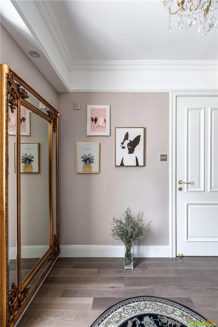 复古全身镜面+童趣可爱的装饰画组合+法式水晶吊灯+异域风情的印花地毯。